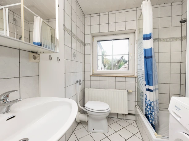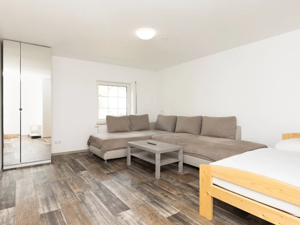 1. Wohnung: ist ca. 33 qm groß (ideal für eine Person) und hat eine separate Einbauküche mit Essecke. eigenes geräumiges Bad mit Dusche und einem Wohnschlafraum mit einer Boxspringschlafcouch ausgestattet.