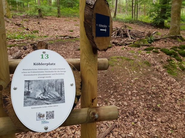 Integriert in den Eisenhammerweg sind fünf Infotafeln der Waldgenossenschaft Hauberg Buschhütten zum Thema Haubergswirtschaft. Mit Hilfe von QR-Codes können im Internet weitere Bilder und Informationen vor Ort abgerufen werden.