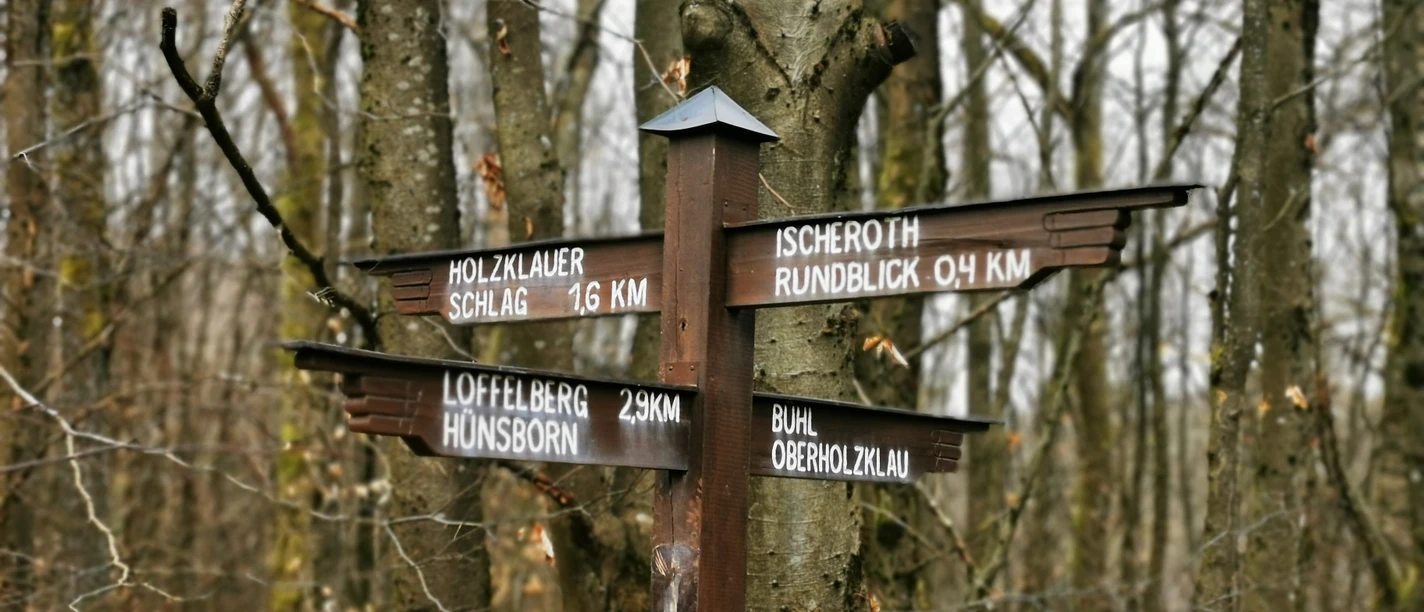 Once we have passed the wind turbine, we turn half-right and follow the trail with its beautiful view over Büschergrund to Löffelberg. Arriving at the top, we can see houses through the forest. At this point, we turn right onto a new path that leads us to the main road. Here, too, we orient ourselves to the right and follow the road for about 400 meters. At the next larger intersection with forest paths, we leave the road again, go half-left into the forest, and follow the path to the four-way intersection. At the intersection, we turn right towards Büschergrund, so that later we come to the "Büscher Schlag." Shortly after the "Büscher Schlag," we go left along the forest edge in the direction of the motorway. We follow the F3 signage to the motorway bridge and cross it. On the ensuing path, we first keep left and then right until a large T-junction, where we continue following the Höhenring to the right. At the next intersection, we keep right again and follow the path uphill until the village of Bühl lies to our left and we reach the Ischeroth, whose summit rewards us with a fantastic view of Siegerland and Sauerland.