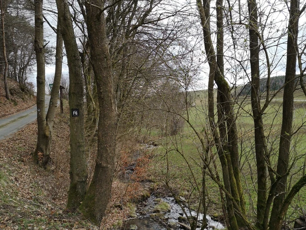 After a short climb past the old slate quarry, we hike following the F6 signs towards the nature reserve "Hermannsteg". Above the path, there is a view of the villages Steinbach, Rüppershausen, Oberndorf, and Rückershausen.