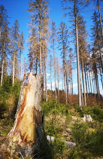 We then continue, always following the hiking trail F8, a short steep ascent with impressively beautiful views over the Lahn and Auerbach valleys, up to Mackelshelle. Once again, it goes briefly steeply left up where the entrance portal to the "Avenue of the Trees of the Year" welcomes us. Then it goes along the slope with only a slight ascent. On this path, accompanied by various trees with their information boards, we again enjoy beautiful views of Feudingen and the Lahn valley. Here we also find the Rothaarsteig rose planted on the occasion of the inauguration of the certified Rothaarsteig route "Ilsetalpfad." Furthermore, an especially long bench invites you to linger and enjoy. Afterwards, it continues through a high forest heavily thinned by windthrow. At a left curve, a short detour to the "Old Sports Ground," later also called the "Fairy Tale Meadow," can be made. The path continues until we meet the path leading downhill to the "Boden." Here we also leave the Ilsetalpfad, which is identical to our hiking trail F8 starting at the information board on the Vesper island. Over the "Boden," a type of high plain now used as grassland lying below the "Hohe Ley" and above the "Sasselberg" with a small hill, we continue always following F8 downhill. This path again opens a wonderful view of Feudingen and the Lahn valley towards Feudingerhütte and Bermershausen from a different perspective. We return to our starting point via the streets "Am Sasselberg," "Zum Ilsetal," and "Im großen Hof" to the information board at the Volksbank on Sieg-Lahn-Straße.