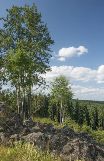 From there we follow the marking to the forest edge. We walk clockwise along a forest path beside the babbling Buchheller, which accompanies us at first. The trail bends at a right angle and we now begin the ascent to the Trödelsteine. Along the way, we encounter the witnesses of ore mining in the Buchhellertal: Stollenmunde and slag residues are relics from the mining era. The summit cross on the Trödelsteine greets us from afar. Upon reaching the summit, good weather rewards us with a view over the green Siegerland. Of course, we sign the summit book. Continuing along the path marked with a white, lying "R", we now go through a new section that has arisen due to the clearing of spruce stands. Upon reaching the Nenkersberg, a distant view opens to us that was not there before. The Eifel or Sauerland are clearly visible! After letting our thoughts wander, we now begin the descent. Shortly, we become border crossers between Rhineland-Palatinate and NRW and pass through narrow paths in mystical forests to the juniper heath in the Saukaute nature reserve. Shortly before the end of the route, we can once again enjoy the view of the unique landscape between Rothaar Mountains and Westerwald. Continuing over narrow paths that still require surefootedness, we return to Wahlbach.