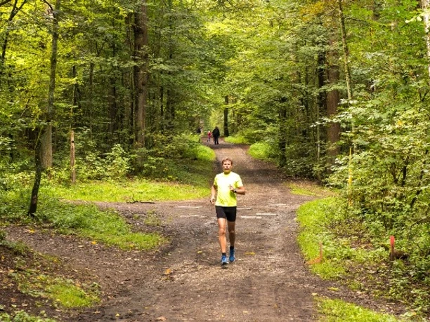 At kilometer 1.25, turn sharply left, follow hiking trail A2 over the footpath, and then run past the ant sculptures. After a downhill section with ground waves, follow the path to the right, which shortly afterwards passes a small rest area (km 1.8), cross it, and run slightly to the right. Then you pass through a beech forest (km 1.9).