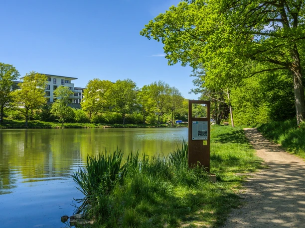 The signage starts with a main sign “P Stadterleben” at the Eicher Weiher parking lot. Path markings along the route assist with further orientation. The “Water features” signs explain the activity and experience points as well as the historical peculiarities of the place. In the Gambach landscape area, they represent the only installation besides the benches.