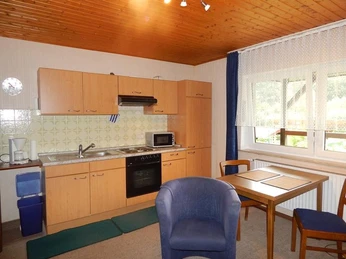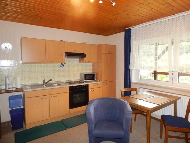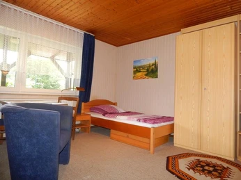 35 m² Appartement im Erdgeschoss, barrierefrei, ebenerdig, separater Eingang. Wohn-Schlafraum mit Einzelbett, komplett ausgestattete Küchenzeile, Mikrowelle, Kaffeemaschine, Wasserkocher und Toaster. TV. Schrankelemente mit viel Stauraum. Bad mit Dusche und WC.