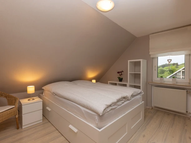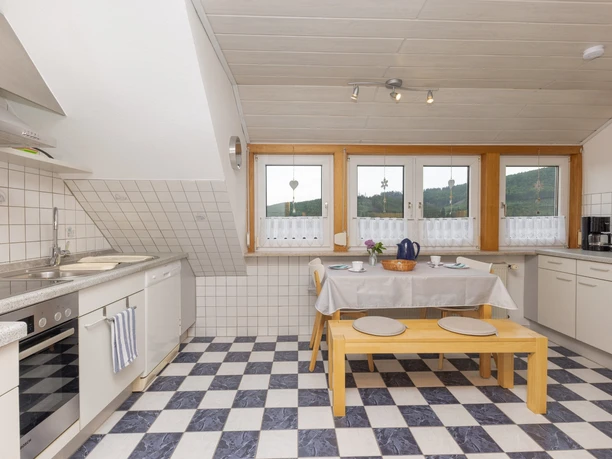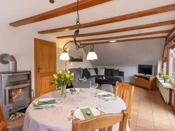 Die 70 qm Wohnung befindet sich im ersten Stock des Hauses und sie teilt sich auf in ein großes Wohn- und Esszimmer mit Kaminofen, eine komplett ausgestattete Küche mit Essgelegenheit, ein Schlafzimmer mit Doppelbett und ein Schlafzimmer mit zwei Einzelbetten.