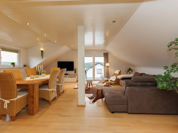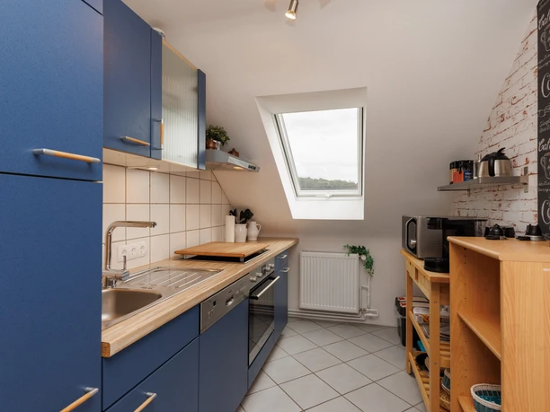 Die Ferienwohnung befindet sich im Dachgeschoss und verfügt über ca. 90 qm Wohnfläche. Aufgeteilt in ein großes helles Wohn-/Esszimmer mit südlich ausgerichtetem Sonnenbalkon mit einer gemütlichen Couch, die auch als zusätzlicher Schlafplatz umfunktioniert werden kann. Eine separate voll ausgestattete Küche, Eingangsflur, Lese-/Arbeitszimmer, neues Bad mit WC, Dusche und Waschmaschine. Schlafen Sie in einem romantischen Schlafzimmer mit drei Schlafgelegenheiten, ein zusätzliches Gästebett kann mit integriert werden.