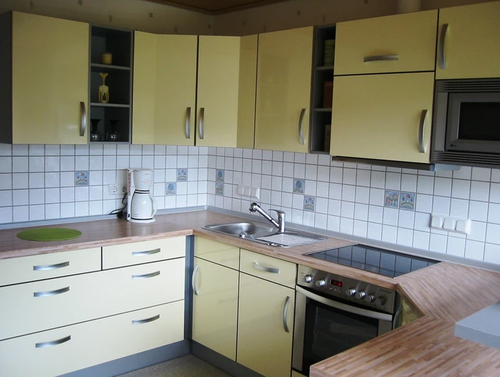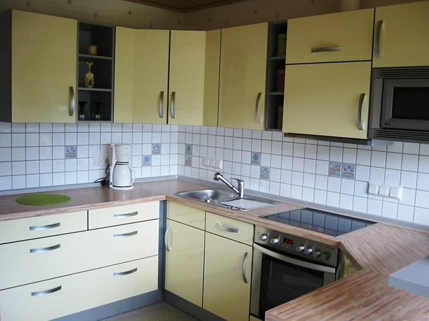 Komplett eingerichteter Küche mit Spülmaschine, Mikrowelle, Herd mit Backofen, Tisch und Esstheke
