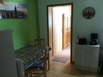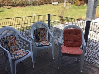 60 m² große Ferienwohnung mit separatem Eingang. Komplett eingerichtete Küche. Wohnzimmer, Bad/Dusche, 3 seperate Schlafräume (2 Einzelzimmer, 1 Zweibettzimmer), auch einzeln buchbar, jedes Zimmer mit SAT-TV, WLan ausgestattet. Bettwäsche, Hand- und Küchentücher werden gestellt. Waschmaschine. Überdachte Balkonterrasse (Raucherecke), Stellplätze vorhanden