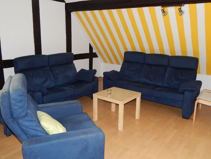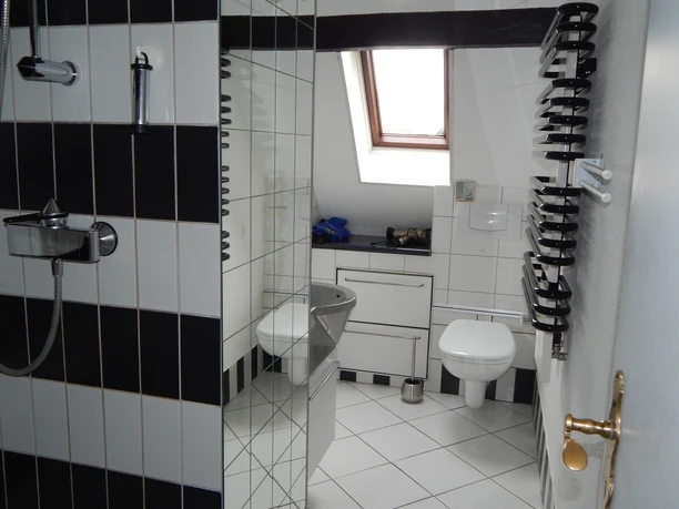 - Ferienwohnung Dachgeschoss: ca. 100 m² - 1 Doppelzimmer, 2 Einzelzimmer, 1 Bad mit Dusche / WC, 1 Bad mit Wanne, WC und Urinal. Essdiele, Küche, Wohnzimmer