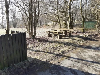 Eine Sitzgruppe in unmittelbarer Nähe ermöglicht es, auch ohne das eigene Equipment auszupacken, einfach "vor der Tür" zu sitzen. Dort befindet sich auch ein Müllgefäß.