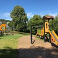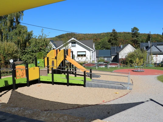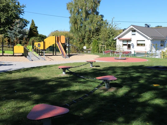 Ausstattung: Sitzgruppe mit Sonnensegel, Vogelnestschaukel, Karussell, Sandkasten mit Sandbagger, Seilparcour, Spieltafeln, Balancierweg, Kombinationsgerät (barrierefrei), zwei Trampoline, mehrere Erwachsenengeräte und Fitnessgeräte.