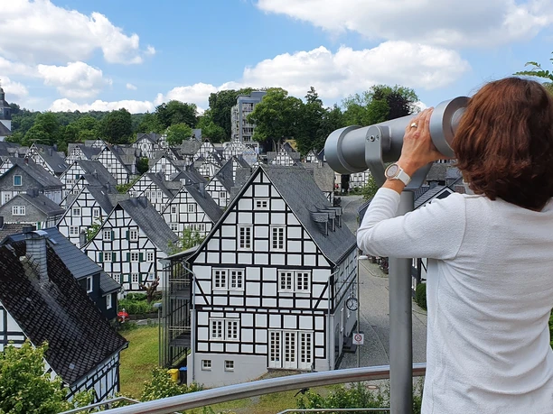 Die rotierende Scheibe (Sehen), der Summstein (Hören und Fühlen), das Oktoskop (Sehen) und das Tastmodell (Sehen und Fühlen) laden hoch über den Dächern Freudenbergs zu einer besonderen Sinneserfahrung ein. Das bronzene Tastmodell, dass ein detailgetreues, dreidimensionales Abbild des Alten Fleckens ist, gibt auch Menschen mit Sehbehinderungen einen guten Eindruck von der Altstadt.