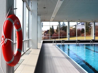 In dem 10x25 m großen Schwimmbecken gibt es einen Wasserfall, eine Regendúsche, Unterwasserdüsen, Sitzmöglichkeiten mit Blick auf das Wasser, sowie im Sommer eine große Liegewiese.