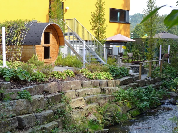 In dem großzügig gestalteten und wunderschön angelegten Saunagarten fühlen sich die Gäste besonders wohl. Hier lassen Sie ihren Blick über die vielen Pflanzen gleiten und schauen auf den natürlichen Bachlauf, um Ruhe und Entspannung zu finden. Bei einem kleinen Spaziergang treffen Sie am Ende des Gartens auf unser Kota-Ruhehaus, eingerahmt von Bäumen liegt es wie ein kleines Schloss am Bachlauf.