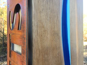 Bis 2012 verlief die Heller in diesem Abschnitt schnurgerade, fast wie mit dem Lineal gezogen. Sie war künstlich begradigt und entlang der Straße in ein enges Bett gezwängt. Heute fließt sie wieder mitten durch das Tal und hat viele kurvenreiche Abschnitte, die man auch Mäander nennt. Auf der Holzstele wird mit der blauen Linie der veränderte Flußlauf nachempfunden - du kannst die Uferränder fühlen.