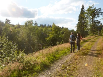 Aus dem Fichtenwald heraus, wird der Weg nun immer freier und führt schlussendlich entlang der Wiesen und Koppeln wieder auf den Wanderparkplatz 'In der Elberndorf' zurück.