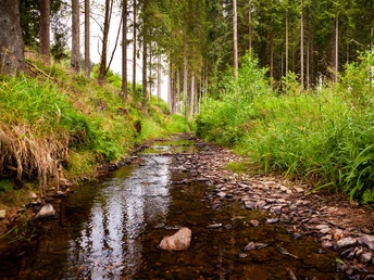 Die nächste Etappe führt wieder in den dichter werdenden Fichtenwald bergab. Hier biegt der Weg, vor der Brücke, die mit ihrem roten Geländer über die Elberndorf führt, wieder recht ab, zurück Richtung Wanderparkplatz.