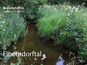 Linksseitig erstreckt sich das Waldwiesental der Elberndorf mit dem mäandernden Bach, während die rechte Seite überwiegend durch Fichtenwald geprägt ist. Nach der Beschilderung des Naturschutzgebiets rechts, führt der Weg zur Denkmalanlage der Waldgenossenschaft Erndtebrück.