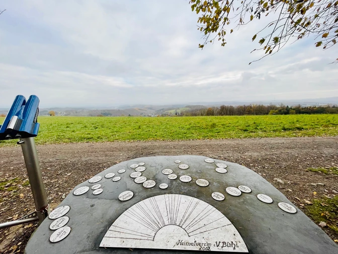 Der Aufstieg lohnt sich allemal! Denn euch erwartet eine herrliche Aussicht auf Siegen, die Ginsburg, den Kindelsberg, die Tiefenrother Höhe bis zum Westerwald. Hier hat der Heimatverein Bühl e.V. mit viel Fleiß und Liebe zum Detail eine Panoramaplatte sowie ein kostenfreies Fernrohr mit Bänken aufgestellt. Ein schöneres Jausenplätzchen findet man selten!