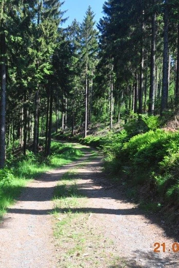 Am Ende dieses kleinen Hohlweges biegen wir halblinks in den breiten Waldweg ein. Kurz darauf verlassen wir Nordrhein-Westfalen und überqueren die Landesgrenze nach Rheinland-Pfalz.