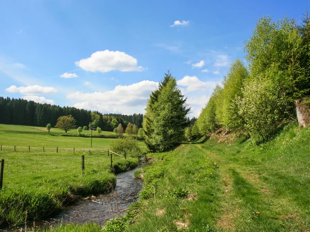 Von der B62 folgen wir der Wabricher Straße bis wir nach rechts auf den Teerweg „Am Fuchsrain“ einbiegen. Der Panoramaweg begleitet uns bis zum Schützenhaus, wo wir zum Eingangsportal des Weges gelangen. Schnell können wir einen Blick von der Aussichtsplattform auf die mäandrierende Benfe erhaschen bevor wir durch einen Pfadabschnitt wandern. Nach 3,5 km erreichen wir einen alten Steinbruch. Der Pfad entfernt sich vom Wasser und lenkt uns durch eine Wiese bergan. Ein steiler Abstieg begleitet uns zurück ins Tal. Hier biegen wir an einem einzelnen Haus links ab. Nach einer Rast am Wanderparkplatz „Am Steinbruch“ kommen wir an einer Quelle vorbei und folgen einem Pfad. Danach geht es rechts über eine Hochfläche zum Kreuzungspunkt mit dem Rothaarsteig. Wir gehen nach links, ins Ahbachtal, an der L719 entlang und umrunden den Augustenhof. Nun biegen wir scharf links ab, um über zwei Ortsteile zur Skihütte Rückershausen zu gelangen. Wir folgen dem Weg durch den Wald bergab nach Oberndorf. Dort gewinnt der Weg wieder an Höhe. Vor der Straße (K33) wechseln wir auf einen Feldweg und queren die Dillstraße in einem Bogen zum Wanderparkplatz „Am Dill“. Hier kreuzen wir die K33 erneut und wandern durch Wald zurück zum Wanderportal.